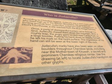 The Keetoowah, called the Cherokee, an indigenous people of North America, believed the carvings on the rock (1,548 of them) were created by a being named Tsu'kalu, translated as Judaculla, a slant-eyed giant known as the Master of Game. He was said to have had tremendous mystical powers, freely able to move between the spirit and physical worlds.